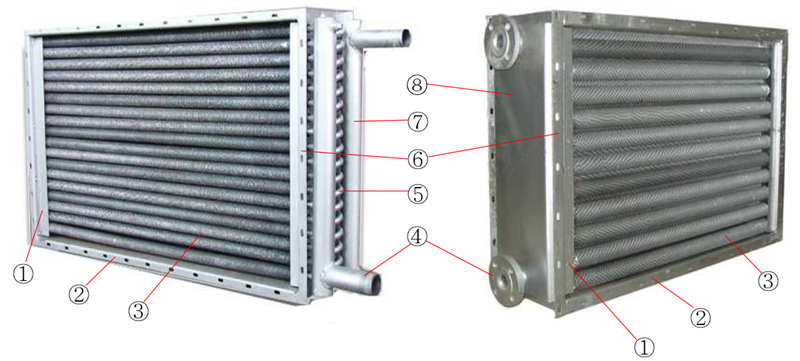 ①挡风板、②连接板、③换热管、④接口、⑤弯头、⑥管板、⑦集管、⑧集箱  ; ; ; ;