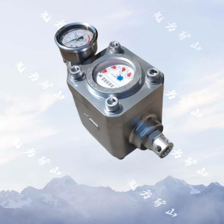 ZGS-6型高压煤层注水表是实施煤层注水防尘措施时的配套设备。外壳体采用强度铝合金,表内采用合金铜,具有耐压强度高、抗腐蚀能力强的特点,可广泛适用于煤矿各水质条件,在高压水表的出水端设置有单向阀、可防止停注时钻孔水倒流将煤粒等杂质带入水表内部导致水表损坏。ZGS6型煤层注水表为多流束凹叶轮速度式磁钢传动干式水表,耐压高,密封性能好,结构简单,数字直读,能同时显示注入水量和注水压力,可与不同压力、不同流量的注水系统相配套。ZGS-6型高压水表主要由水量数字显示记数机构、驱动机构及压力表组成,进入高压水表的水在经过叶轮组时推动叶轮旋转,配置其间的磁力传动装置带动水量数字显示记数机构记录流经水表的水量。