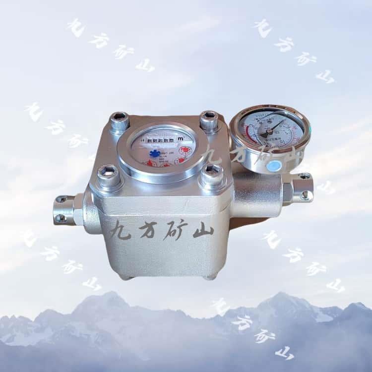 泰安市九方矿山设备有限公司生产的GGS-E型煤层注水流量计是实施煤层注水防尘措施时的配套设备。外壳体采用强度铝合金,表内采用合金铜,具有耐压强度高、抗腐蚀能力强的特点,可广泛适用于煤矿各水质条件,在高压水表的出水端设置有单向阀、可防止停注时钻孔水倒流将煤粒等杂质带入水表内部导致水表损坏。煤层注水流量计为多流束凹叶轮速度式磁钢传动干式水表,耐压高,密封性能好,结构简单,数字直读,能同时显示注入水量和注水压力,可与不同压力、不同流量的注水系统相配套。GGS-E型注水表主要由水量数字显示记数机构、驱动机构及压力表组成,进入高压水表的水在经过叶轮组时推动叶轮旋转,配置其间的磁力传动装置带动水量数字显示记数机构记录流经水表的水量。