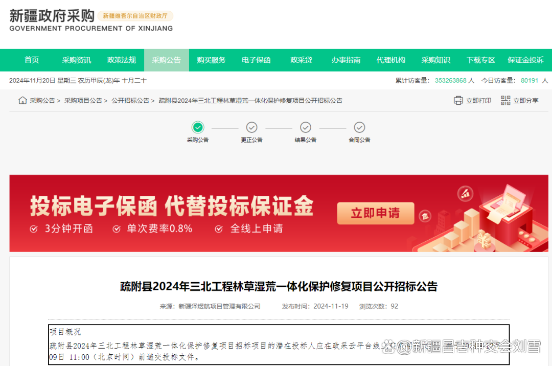 墨玉县2024年三北工程林草湿荒一体化保护修复项目招标项目的潜在投标人应在政采云平台线上获取招标文件,并于2024年12月10日 11:00(北京时间)前递交投标文件。