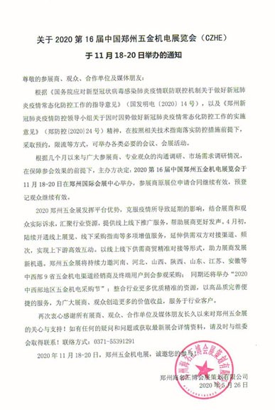 2020年中国国际五金展(CIHS 2020)延期公告鉴于全球新型冠状病毒仍在持续,依据国家和上海市政府最新防疫要求,为确保广大展商、采购商和专业观众的身体健康和生命安全,中国五金制品协会及科隆展览审慎决定:原定于8月7-9日在上海浦东新国际博览中心举行2020-07-13