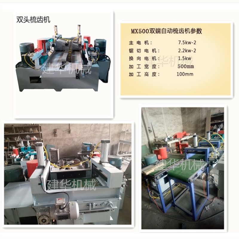 mx400型自动双端梳齿榫开榫机由机架部件、传动部件、送料、压料部件,气压系统、液压系统和电气系统控制组成。主要工作表面全部经过车、铣、磨等工艺加工,保证芯条梳齿精度;整机采用PLC程序控制,实现了芯条的输送、划线、齐头齐头锯、梳齿及回转全过程的自动加工。