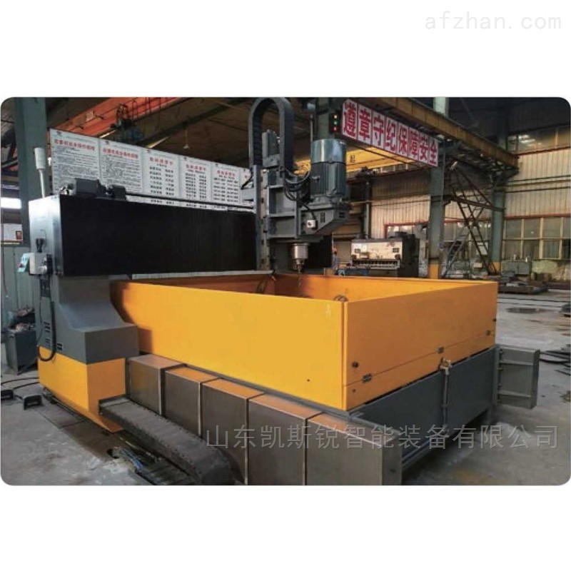 2、移动龙门采用钢板组焊而成,经人工时效处理。在龙门前侧安装有两条直线滚动导轨副和一个液压式动力头,并在龙门上方安装有一套精密滚珠丝杠副,滚珠丝母经固定盒与液压动力头背板相连固定。通过AC伺服电机经由同步带轮带动滚珠丝母旋转,使液压动力头沿Y轴方向移动,确保钻孔位置的高精度和重复定位精度。在动力头的两侧安装有导轨柔性防护罩。