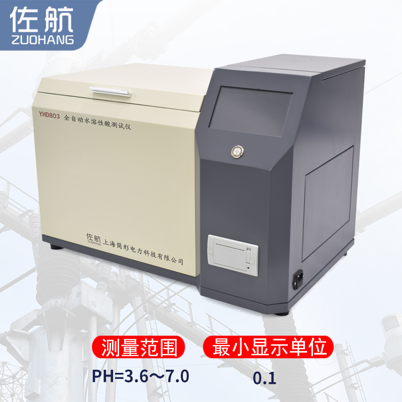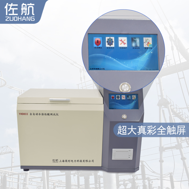 佐航YHD803全自动水溶性酸测试仪(比色法)是根据中华人民共和国国家标准GB/T7598-2008运行中变压器油水溶性酸测试法及相关标准设计制造。采用大屏幕液晶显示,利用微处理器控制,可以根据用户的设定条件自动完成加热、恒温、振荡、取样、测试、清洗、打印等功能,可以一次性测量1-6个样品,大大缩短了用户的测试时间。