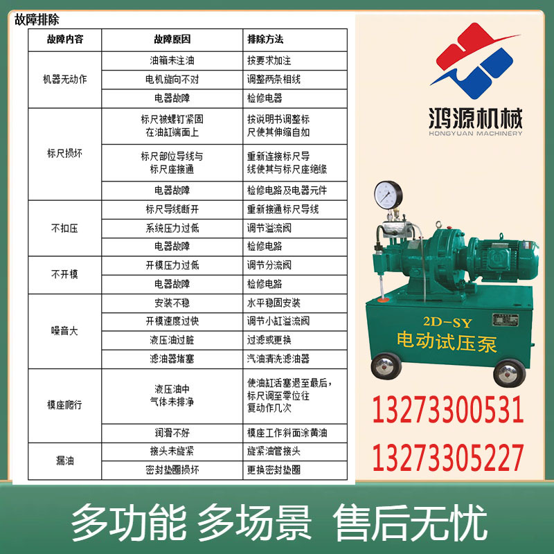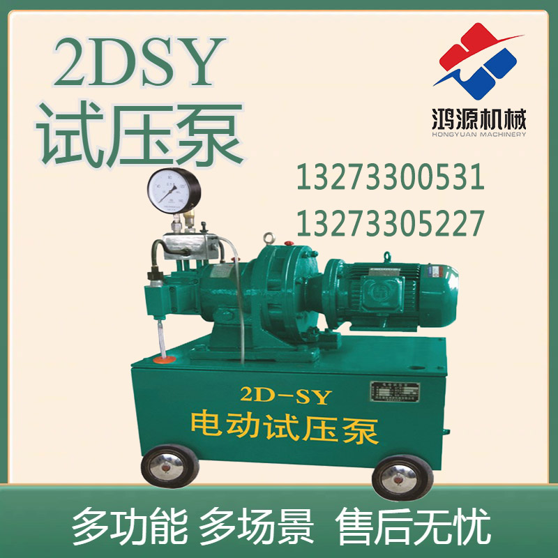 2D-SY50/100、2D-SY40/130型电动试压泵是电动双缸往复移动式试压泵,主要是对压力容器、化工设备、压力仪表、管道阀门等做水压、密封、强度和爆破试验,及实验室获得高压液体。实验介质为水、运动粘度≤45mm2/s油类,或类似于水、油的液体。