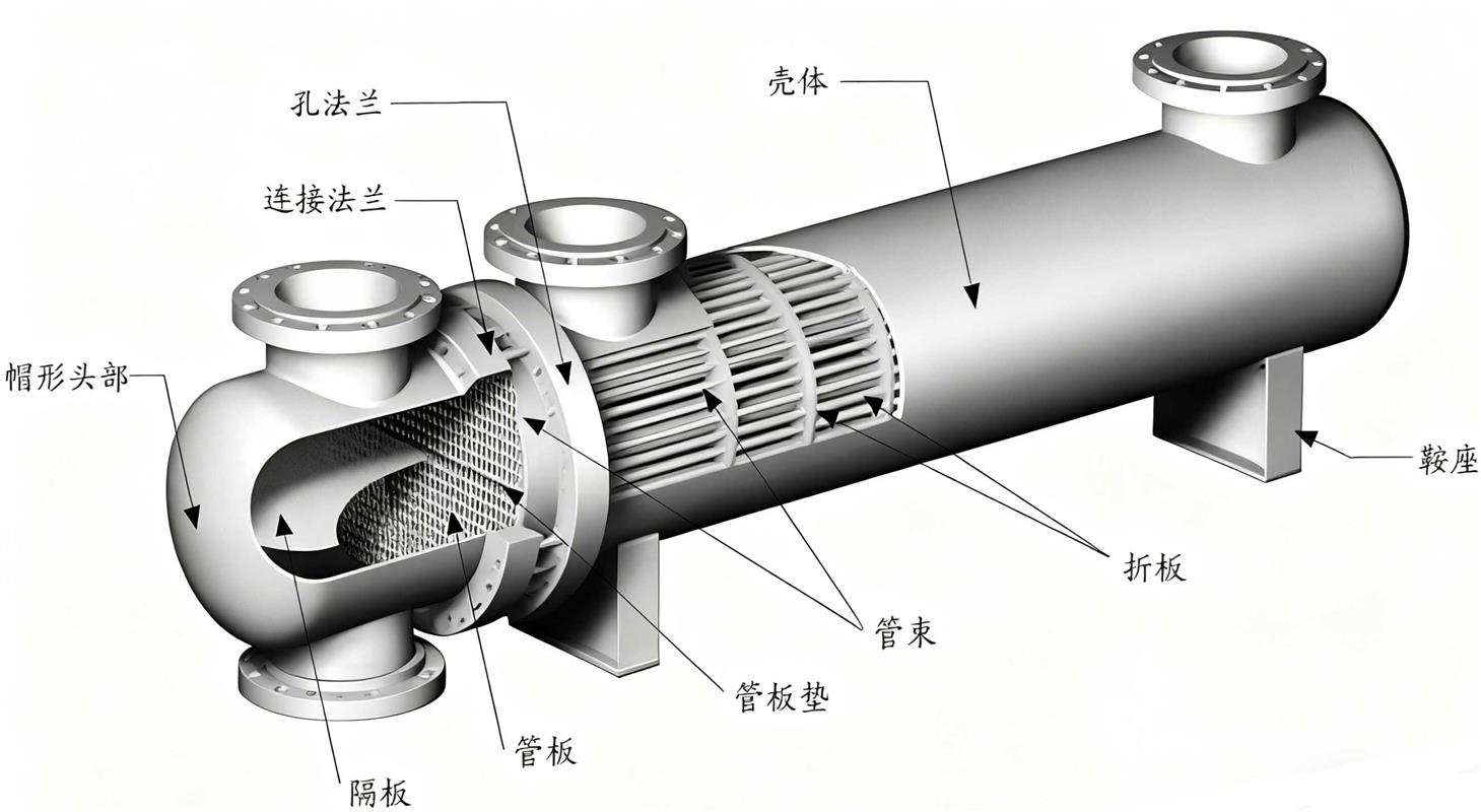 管壳式换热器由壳体、传热管束、管板、折流板(挡板)和管箱等部件组成。壳体多为圆筒形,内部装有管束,管束两端固定在管板上。进行换热的冷热两种流体,一种在管内流动,称为管程流体;另一种在管外流动,称为壳程流体。为提高管外流体的传热分系数,通常在壳体内安装若干挡板。挡板可提高壳程流体速度,迫使流体按规定路程多次横向通过管束,增强流体湍流程度。换热管在管板上可按等边三角形或正方形排列。等边三角形排列较紧凑,管外流体湍动程度高,传热分系数大;正方形排列,则管外清洗方便,适用于易结垢的流体。