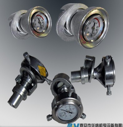 本产品主要由表头U型卡。侧体。顶针、防震压力表和壳体组成,使用时先将U型卡套在三用阀上,再将侧体口插入U型卡上,旋转U型卡,使测体口与三用阀吻合一起,然后稍加用力旋转压力表防震壳体,此时顶针恰好打开三用阀内的球形单向阀,使支柱内液体压力等值地沿侧体内顶针周边传入压力表,即可从表上读出支柱的初撑力(工作阻力)值