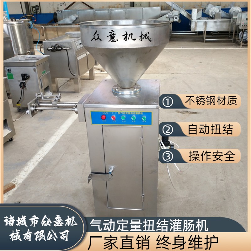 气动定量灌肠机结构紧凑,设计合理。外形美观,小巧玲珑,与肉食接触部分及外包装全部采用优质不锈钢制造。气动定量灌肠机操作简单,易于清洗,定量准确,误差不超过?3g。气动定量灌肠机能灌制大中小各种规模的肠制品。该产品外观美观,做工精良,操作方便,使用安全可靠。
