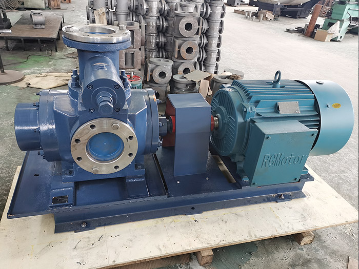 外啮合的螺杆泵,它利用相互啮合,互不接触的两根螺杆来抽送液体。双螺杆泵为一种双吸式非密闭的双螺杆泵。一端伸出泵外的主动螺杆由原动机驱动。主动螺杆与从动螺杆具有不同旋向的螺纹。螺杆与泵体紧密贴合。从动螺杆是通过同步齿轮由主动螺杆带动的。双螺杆泵作为一种容积式泵,泵内吸入室应与排出室严密地隔开。因此,泵体与螺杆外圆表面及螺杆与螺杆间隙应尽可能小些。同时螺杆与泵体、螺杆与螺杆间又相互形成密封腔,保证密闭,否则就可能有液体从间隙中倒流回去。双螺杆泵可分为内置轴承和外置轴承两种形式。在内置轴承的结构型式中轴承由输送物进行润滑。外置轴承结构的双螺杆泵工作腔同轴承是分开的。由于这种泵的结构和螺杆间存在的侧间隙,它可以输送非润滑性介质。此外,调整同步齿轮使得螺杆不接触,同时将输出扭矩的一半传给从动螺杆。正如所有螺杆泵一样,外置轴承式双螺杆泵也有自吸能力,而且多数泵输送元件本身都是双吸对称布置,可消除轴向力,也有很大的吸高。