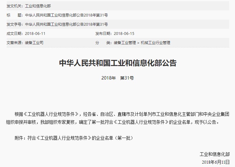 为贯彻落实《机器人产业发展规划(2016-2020年)》,加强工业机器人产品质量管理,规范行业市场秩序,维护用户合法权益,保护工业机器人本体生产企业和工业机器人集成应用企业科技投入的积极性,6月15日,国家工业和信息化部办公厅对全国首批符合《工业机器人行业规范条件》的企业名单进行公示,广州数控设备有限公司成功入选为全国首批15家符合《工业机器人行业规范条件》的企业之一。
