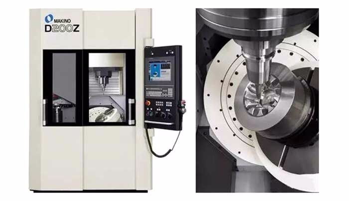 五轴立式加工中心D200Z是牧野D系列中规格最小,但最灵敏的五轴联动机床,专注于小型模具的高效高品质表面加工。机床采用了约45?斜面结构“悬臂”旋转工作台。工件在工作台上,无论重量和姿态如何,其重心变动均可限制在很小幅度。这样防止了弯曲和扭曲变形,提高了加工精度。